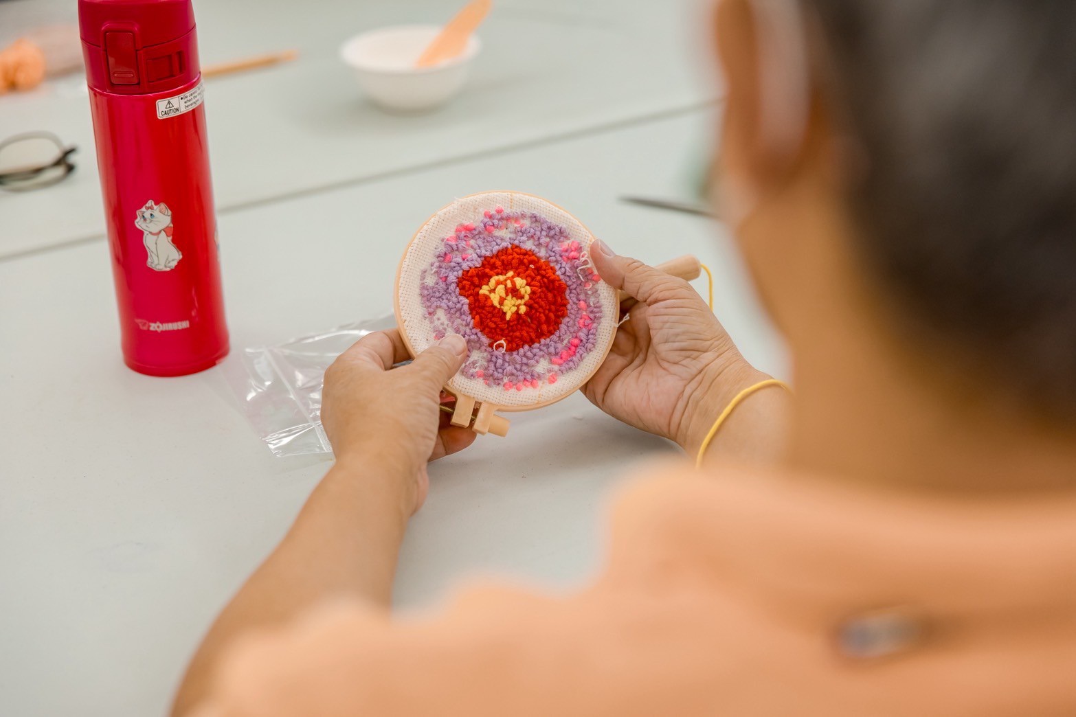 在戳繡的過程裡,有人專注於線與布的交織,享受安靜的時光;有人與身旁的朋友分享生活片段,在笑語中完成作品。不同的節奏,都在這堂課裡被溫柔地接納。