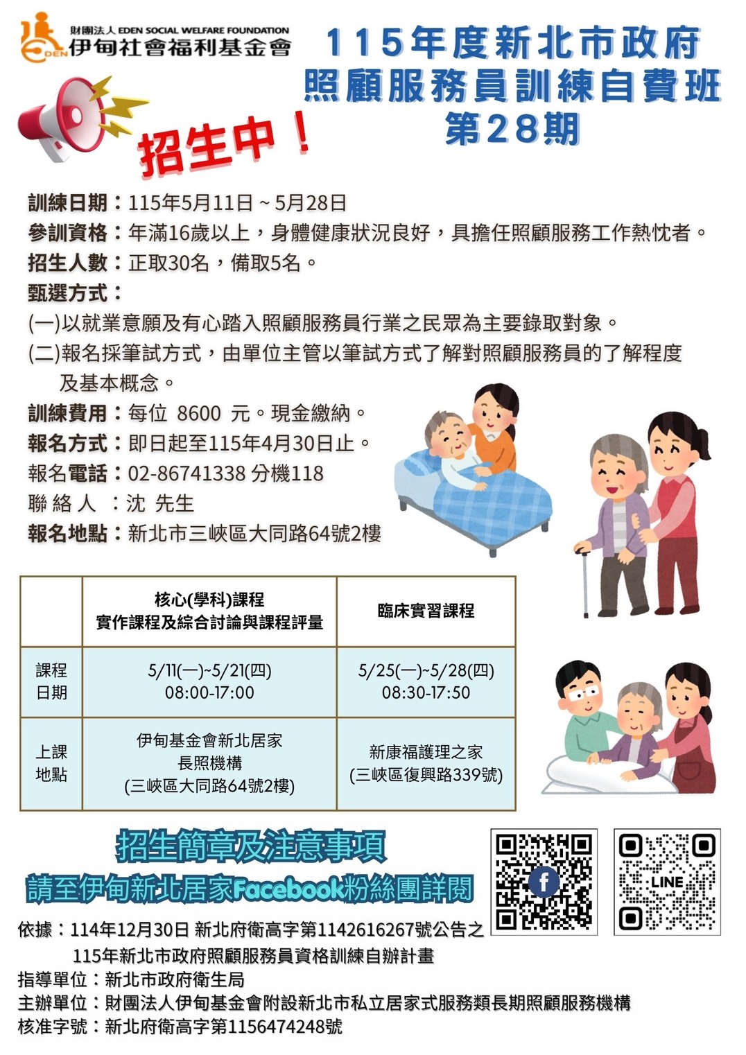 【招生中】115年度新北市政府照顧服務員訓練班(第28期)